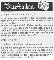 In der Werkzeitungsausgabe vom Mai 1938 liest man unter der Rubrik „Briefkasten“ auf der letzten Seite: