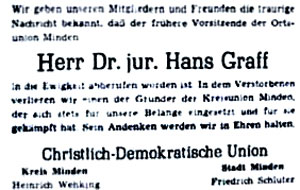 Nazis am Hissen der Hakenkreuzfahne gehindert An Graffs politischen Werdegang in Berlin sind sein Engagement im rechten nationalen Spektrum (DNVP Stadtrat bis zum Verbot dieser Partei 1933) und sein Berufsverbot von 1934 charakteristisch. Zum Berufsverbot kam es, weil Graff am 7. März 1933 einen Nazi -Sturmführer und 12 Mann daran hinderte, auf dem Schöneberger Rathaus die Hakenkreuzfahne aufzuziehen.9 Graff stellte auch in den Folgejahren gegenüber den Nazis außerordentlichen Mut unter Beweis. In seiner Wiedergutmachungsakte wird ihm vom Zeitzeugen Fritz Dittmann aus Berlin attestiert, dass er sich in seiner Eigenschaft als Vorsitzender der Vereinigung ehemaliger Schüler am Wilhelm-Gymnasium bei der Organisierung von Klassentreffen und Wanderungen noch im Krieg von niemandem davon abhalten ließ, mit jüdischen Mitschülern Kontakt zu halten und sie ebenfalls einzuladen.10 Die oben von Keber zitierte judenfreundliche Äußerung rief die Mindener Gestapo auf den Plan. Keber nannte in den „Heimatblättern“ das Jahr 1944 als Datum. In der Wiedergutmachungsakte ist vom März 1945 die Rede. Wörtlich heißt es in einer eidesstattlichen Erklärung von Landrat a.D. v. Gescher: Der Pfarrer habe „von der Kanzel so offen die Wahrheit gesagt, dass er noch im März 1945 von der Gestapo nach Bad Eilsen geholt wurde.“11 Zeitzeugin Gisela Berg, die am 23. Februar 1945 von Graff konfirmiert wurde, erinnert, dass der Pfarrer „ab März plötzlich verschwunden war“, obwohl Konfirmanden in der Regel seelsorgerlich weiter betreut wurden.12 Gescher meint: „Graff dürfte seinem Schicksal nur durch frühzeitiges Eintreffen der alliierten Truppen entgangen sein.“ Dr. Kurt Herter aus Hannover war nach dem Krieg mit Graff sehr eng befreundet, nachdem sich beide in der Loge kennen gelernt hatten. Er ergänzt, dass Graff Anfang April 1945 in den Wäldern bei Rinteln von der SS erschossen werden sollte. Die Exekution sei von plötzlich vorrückenden Engländern verhindert worden.13 Graffs Ernennung zum Landrat in Minden durch die Engländer war nur von kurzer Dauer, von Ende April bis Ende Juni 1945. Im Keber-Nachlass heißt es dazu: Graff habe die ihm „von der Besatzungsmacht gestellten Zumutungen auf die Dauer nicht mit seiner Auffassung von der Stellung eines preußischen Beamten vereinbaren“ können.14 Graff war laut Herter ein „konsequent wertkonservativer Mann, der keine Furcht zeigte.“ Mit den Engländern sei er gleich bei seiner Befreiung aus den Händen der SS aneinander geraten. Sie wollten seine verhinderten Henker erschießen. Graff habe sich mit den Worten, „keine Exekution ohne ordentliches Gerichtsverfahren“, dazwischen gestellt und eine Arretierung bewirkt. Später ist Graff nach Herter mit der Besatzungsmacht unter anderem darüber in Streit geraten, weil er in Gefängnissen und Lagern einsitzende Nazis seelsorgerisch mitbetreuen wollte. „Jetzt sollen alle Engel sein“ Graff war wegen eines dringenden Hilferufs aus dem Kirchenkreis am 1. Februar 1944 an die Mindener Martinikirche gekommen. Die Pfarrer Joachim Steinbrück (wegen Krankheit) und Martin Berthold (wegen Wehrdienst) waren ausgefallen. Graff vertrat in Minden zeitweise fünf Pfarrer und half auch auf den Dörfern aus.15 Als die beiden genannten Pfarrer wieder dienstfähig waren, wurde Graffs weitere Tätigkeit in der Martinigemeinde im Dezember 1945 beendet.16 Er wurde als Hilfsprediger der Gefangenenseelsorge zugewiesen.17 Später wurde Graff „Bevollmächtigter für das Gnaden- und Wohnungswesen“ bei der Landeskirche, und verblieb so weiter im Status des Hilfspredigers. Er sollte Gnadengesuche von so genannten war criminals prüfen, die von alliierten Militärgerichten verurteilt waren. Falls vertretbar sollte Graff Strafen aufschieben bzw. mindern helfen.18 Graff bemühte sich, folgenden selbst aufgestellten Grundsatz anzuwenden: „Es ist verwerflich und schändet den deutschen Namen, wenn man jetzt die Rückgabe jedes Kriegsverbrechers verlangt; jetzt sollen alle Engel sein. Die Kirche wird unglaubwürdig, wenn sie die Herausgabe von Menschen verlangt, die ihr Schicksal verdient haben.“19 Dass Graff seine Worte, trotz entgegen gesetztem Zeitgeist, ernst nahm, zeigte sich am Fall des SS-Majors Willi Schweitzer aus Minden. Der saß seit Kriegsende in Haft, weil ihm vorgeworfen wurde, den Befehl zur Erschießung von zwei notgelandeten amerikanischen Fliegern erteilt zu haben. Schweitzers Gnadengesuch wurde von höchster Stelle, unter anderen von Bundeskanzler Konrad Adenauer und hohen Amtsträgern aus beiden großen Kirchen20, unterstützt. Graff, der sich des Gesuchs zunächst angenommen hatte, sah Schweitzers Angaben als unglaubwürdig an und hielt dem Inhaftierten vor: „Es ist mir unverständlich, dass ein Major, wenn ein Leutnant einen Mord begeht (Schweitzer und der Todesschütze befanden sich zusammen am Tatort, der Verfasser), diesen nicht festnehmen darf und muss.“ 21 Graff weigerte sich, den Fall weiter zu betreiben und brachte auch Mindener Kleinstadthonoratioren gegen sich auf. Der städtische Hauptausschuss hatte auf Antrag der FDP den Rat der Stadt „einstimmig“ beauftragt, „bei dem Oberbefehlshaber der Armee der Vereinigten Staaten eine Begnadigung zu befürworten“22. Vormalige SS-Leute müssen damals in Minden viel Rückendeckung gehabt haben. Noch 1956 fand auf Kanzlers Weide ein Treffen von Angehörigen der ehemaligen Waffen-SS mit 10 000 Teilnehmern statt. Der stellvertretende Bürgermeister, Dr. Mosel, (FDP) erklärte in seinem Grußwort: „Wir sehen in Ihnen die Männer, die den einmal geschworenen Eid bis zur letzten Sekunde hielten.“23 Hilfsprediger geblieben Graffs Geradlinigkeit ist anscheinend auch von seiner Kirche nicht nur positiv vermerkt worden. In seinen Personalakten im landeskirchlichen Archiv in Bielefeld finden sich neben dem Fall Schweitzer Hinweise, dass der Pastor vom Landeskirchenamt ermahnt wurde, bei strittigen Fällen gegenüber Ministerien 