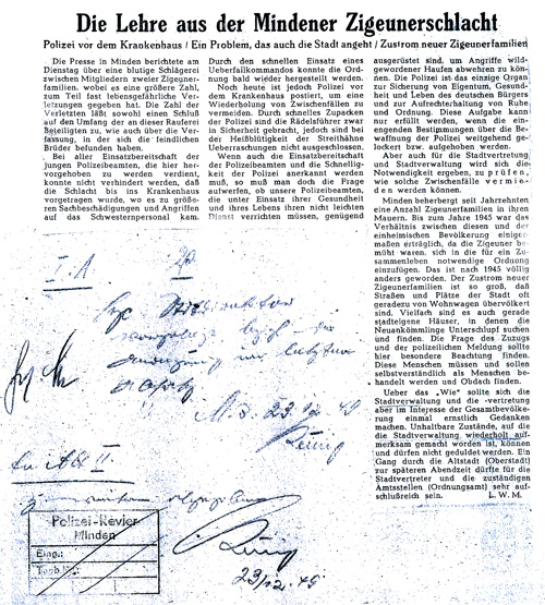 Nach dem Krieg: Grauzone zwischen Ausgrenzung und Duldung Mit der deutschen Kapitulation vom 8. Mai 1945 ist zugleich die „Zigeunergesetzgebung“ in ihrer völkisch-nationalsozialistischen Variante aufgehoben worden. Nicht aufgehoben oder überwunden sind aber tradierte Vorurteile gegen Sinti und Roma und die Tatsache, dass bisher hierzulande keine andere Minderheit in vergleichbarer Weise bei Aufklärung und Wiedergutmachung „vergessen“ wurde und wird. Artikel aus der „Freien Presse“ vom 23.12.1949 / Nr. 199 Im obigen Artikel in der "Freien Presse" vom 23. Dezember 1949 ist unter anderem zu lesen: "Minden beherbergt seit Jahrzehnten eine Anzahl von Zigeunerfamilien in ihren Mauern. Bis zum Jahre 1945 war das Verhältnis zwischen diesen und der einheimischen Bevölkerung einigermaßen erträglich, da die Zigeuner bemüht waren , sich in die für ein Zusammenleben notwendige Ordnung einzufügen. Das ist nach 1945 völlig anders geworden. (Redaktionelle Hervorhebung, siehe auch die Anmerkung unten) Der Zustrom neuer Zigeunerfamilien ist so groß, dass Straßen und Plätze der Stadt oft geradezu von Wohnwagen übervölkert sind. Vielfach sind es auch gerade stadteigene Häuser, in denen die Neuankömmlinge Unterschlupf suchen und finden. Die Frage des Zuzugs und der polizeilichen Meldung sollte hier besondere Beachtung finden. Diese Menschen müssen und sollen selbstverständlich als Menschen behandelt werden und Obdach finden. Über das 'Wie' sollte sich die Stadtverwaltung aber im Interesse der Gesamtbevölkerung einmal ernstlich Gedanken machen. Unhaltbare Zustände, auf die die Stadtverwaltung wiederholt aufmerksam gemacht worden ist, können und dürfen nicht geduldet werden. Ein Gang durch die Altstadt (Oberstadt) zur späteren Abendzeit dürfte für die Stadtvertreter und die zuständigen Amtsstellen (Ordnungsamt) sehr aufschlussreich sein." Anmerkung: