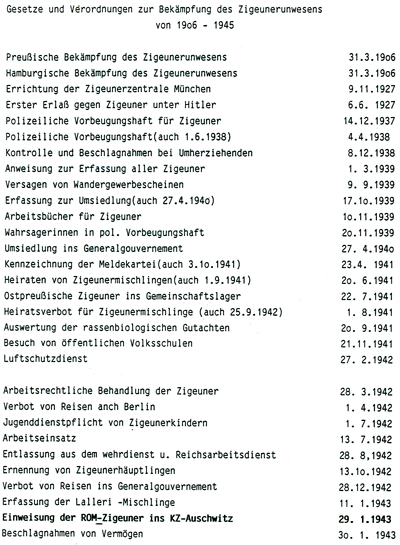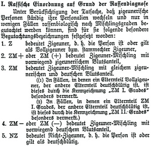Im Verlauf des Kriegs wurden vor allem so genannte Zigeunermischlinge analog zur Endlösung der Judenfrage aus dem Deutschen Reich nach Osten deportiert. Himmlers Auschwitzerlass ist am 16. Dezember 1942 ergangen. Danach sollten die letzten, etwa noch 10 000 in Deutschland lebenden „Zigeunermischlinge, Rom-Zigeuner, nicht-deutschblütigen Angehörigen zigeunerischer Sippen balkanischer Herkunft“ in den folgenden Monaten nach Auschwitz verschleppt werden.