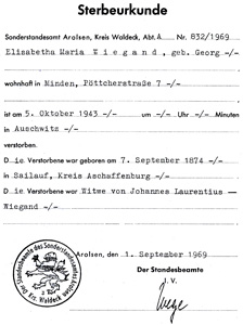 Foto der Familie Wiegand Das 1922 in Minden aufgenommene Foto zeigt unten von rechts nach links: Otthilie Wiegand, später verheiratete Schmitz, Heinrich Wiegand, Heida Wiegand, geb. Weiß (in Auschwitz umgekommen); dahinter stehend Wilhelm Wiegand (in Auschwitz umgekommen), Moka Wiegand, die Tochter von Heida und Wilhelm Wiegand (in Auschwitz umgekommen), Elisabeth Maria Wiegand (in Auschwitz umgekommen), dahinter stehend Johannes (Laurentius) Wiegand (mit Hut), Stephan Wiegand (in Auschwitz umgekommen), dahinter stehend Apolonia Wiegand, später verheiratete Winterstein. Über die in Minden verbliebenen Sinti hatte Flessner erklärt: „Bleiben durften nur die reinrassischen Zigeuner von der Sippe M., K. und L.“ Diese Aussage trifft nur zum Teil zu. Marseli Winterstein wies z.B. darauf hin, dass auch seine Familie von Ritter als „reinrassig“ eingestuft und nicht deportiert worden ist. Der Vater Adam Winterstein habe in Minden bis zum Kriegsende weiter als Lastwagenfahrer gearbeitet. Auch verschiedene als „Zigeunermischling“ eingestufte Mindener Sinti waren von der Deportation nach Auschwitz ausgenommen worden. Vermutlich wurde der chronische Arbeitskräftemangel des Regimes von den lokalen Verfolgungsbehörden als zusätzliches Kriterium bei der Umsetzung von Himmlers „Auschwitzerlass“ berücksichtigt. Die meisten Mindener Sinti, die nicht nach Auschwitz kamen, sind im Frühjahr 1944 vom Arbeitsamt dem so genannten OT-Lager Störmede bei Lippstadt zugewiesen worden. Die Einweisung von „wehrunwürdigen Personen“ in Arbeitslager der Organisation Todt erfolgte erneut auf Verfügung Himmlers.
