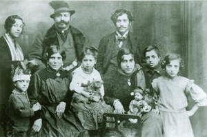 Dokumente und Fotos Familie Winterstein vor ihrem Wohnwagen (Wurdi) am am Königswall um 1932. Marseli Winterstein, der die Fotos von seiner Familie und von der Familie Wiegand zur Verfügung gestellt hat, ist 2007 in Minden verstorben. Unten von rechts nach links sitzend: Marseli Winterstein, Cousine Leila (Elisabeth), Bruder Wilhelm, Mutter Apolonia Winterstein geb. Weigand, Bruder Rigo, Söni Georg (Vetter von Apolonia Winterstein), stehend: Vater Adam Winterstein und Otthilie Schmitz, geb. Wiegand (Schwester von Apolonia Winterstein).